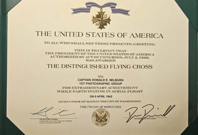 Why did it take so long for Don Wilburn to receive the Distinguished Flying Cross – eighty-three years? Tragically, after arriving back in Washington DC in 1942, he was assigned to duty at MacDill Field in Florida and on a solo flight to the base he was killed when his plane went down in bad weather on June 1, 1942.
