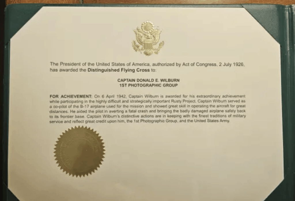 Don Wilburn’s ability to recover from the catastrophic failure and his safe landing of the severely damaged aircraft was critical in getting photographs and intelligence immediately back to The Pentagon. Don Wilburn’s plane was the only aircraft that could get the photographs needed, and crashing would have killed Elliott Roosevelt, causing a huge blow to America’s morale as a whole.”