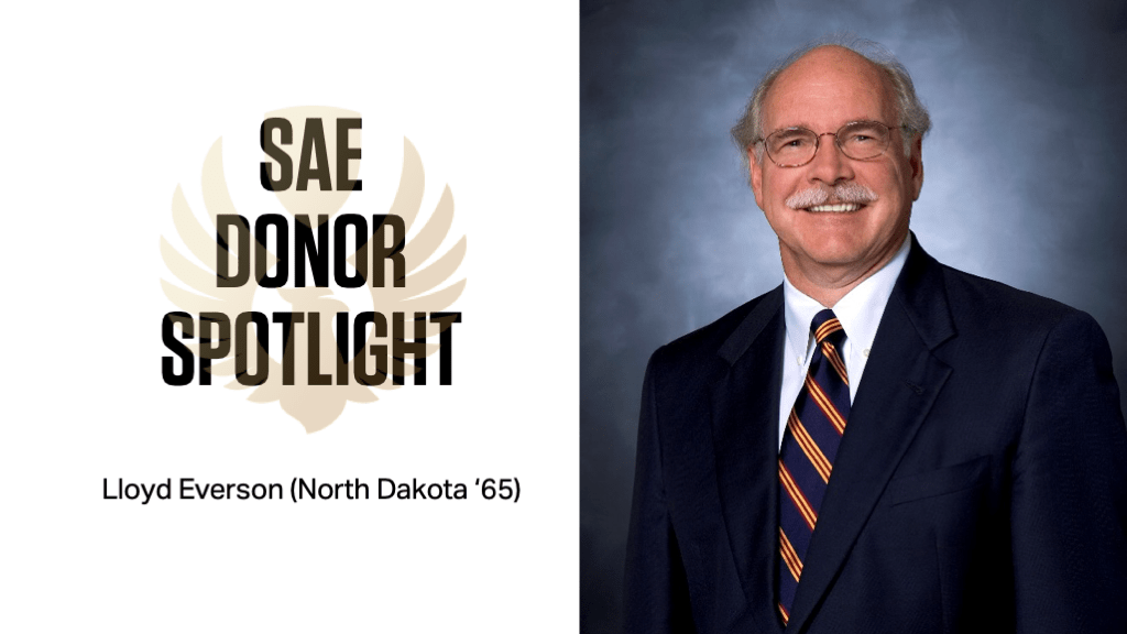 Lloyd Everson is a member of the North Dakota Alpha chapter at the University of North Dakota. He is a devoted supporter of the SAE Foundation because SAE was an important part of his college life and formative years in education and life. He is a Ruby Level donor and has made regular contributions to the Annual Loyalty Fund for the last 25 years. Read more about Lloyd below and click here for more information about the SAE Foundation.