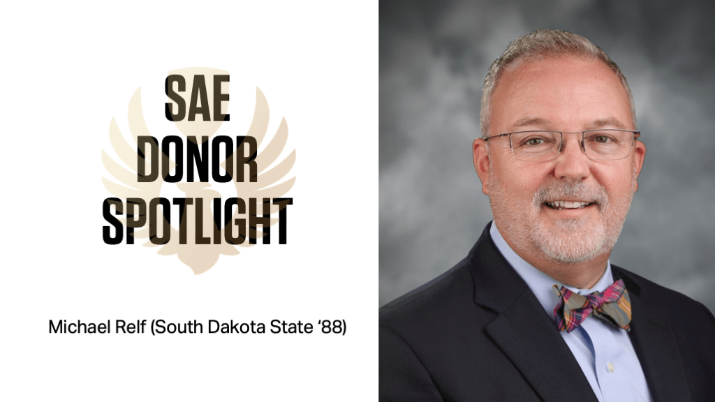 Michael Relf is a member of the South Dakota Theta chapter at South Dakota State University. He is a devoted supporter of the SAE Foundation because he believes in the mission of SAE and wants to ensure that current undergraduates can benefit from their membership. He is a Silver Level donor ($5,000-9,999) and made one of the largest donations to the Shrine of Minerva Campaign. Read more about Michael below and click here for more information about the SAE Foundation.