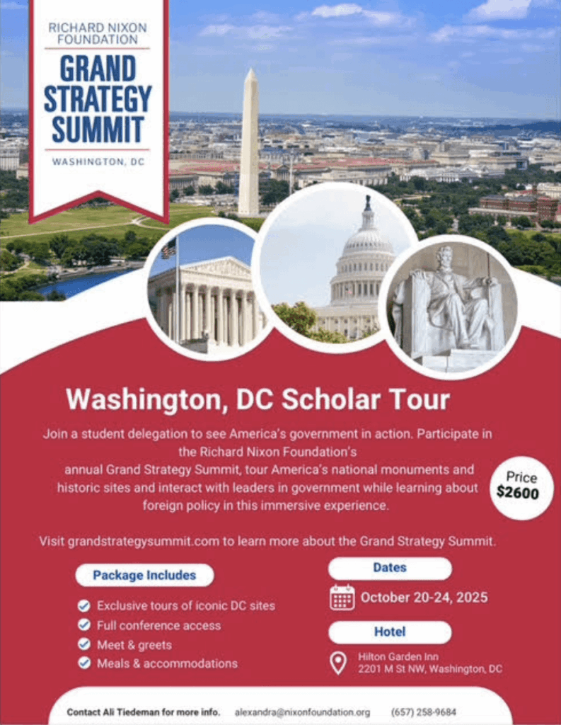 Erick Perez, a senior member of SAE at Cal State Fullerton, has been selected as one of only ten students chosen by the College of Business to attend the Richard Nixon Grand Strategy Summit in Washington, D.C. Through his involvement with SAE, the Latino Business Student Association, and his work in the Dean’s Office, Erick earned this incredible opportunity.