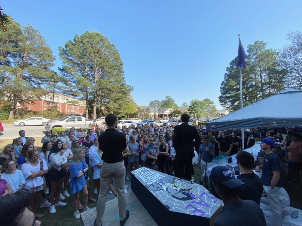 On Monday, March 28, 2022, they started Paddy Murphy week with a “Paddy Murphy Funeral Procession.” The SAE chapter carried their empty coffin throughout campus, where sorority members waited outside their houses and joined them in their formal march. Once they reached the fraternity house, Campbell and Jordan spoke about the story of Paddy Murphy and held a Zaxby’s catered dinner that anyone could attend upon purchasing a ticket. Each sorority member who purchased a ticket would be placed in their chapter’s jar, and the sorority that purchased the most tickets received the most points for that day’s activity.