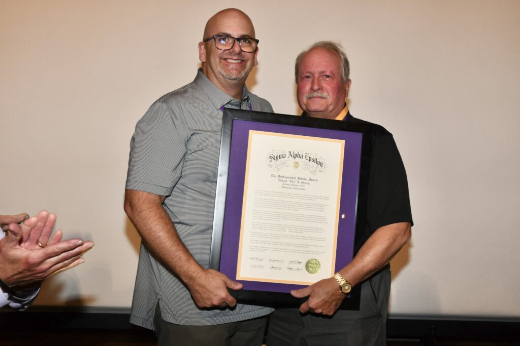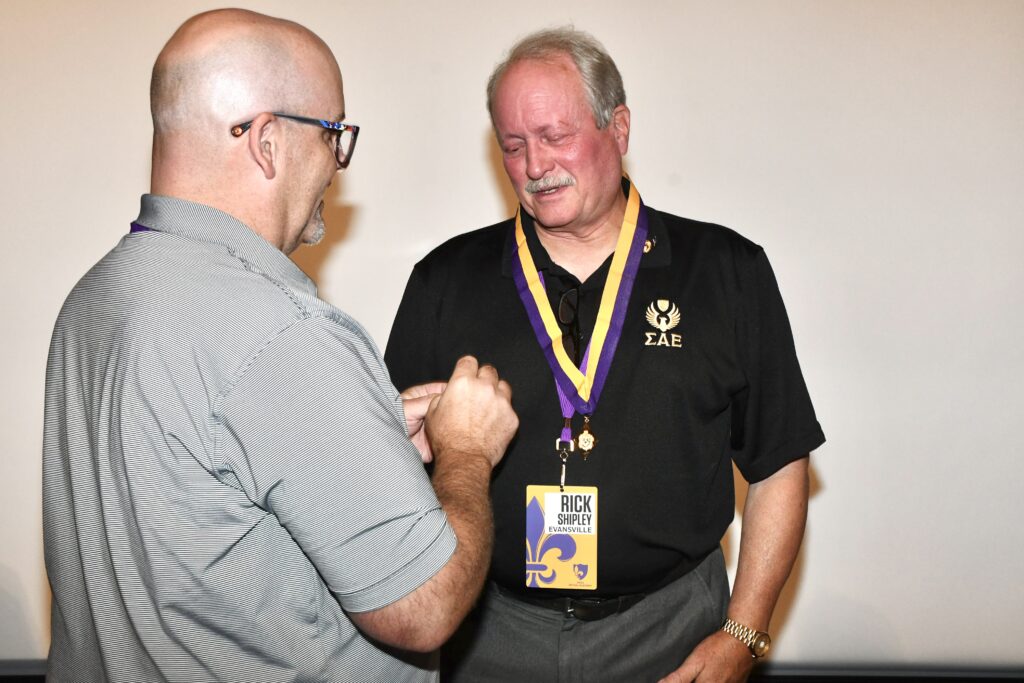 The Fraternity has 345,000+ initiated members; only 162 have been recognized with the Distinguished Service Award. Richard L. “Rick” Shipley (Evansville ‘79), one of the most recent recipients, presented to him during the 2024 Ritual Academy of Sigma Alpha Epsilon in Evanston, Illinois, on August 3, 2024.